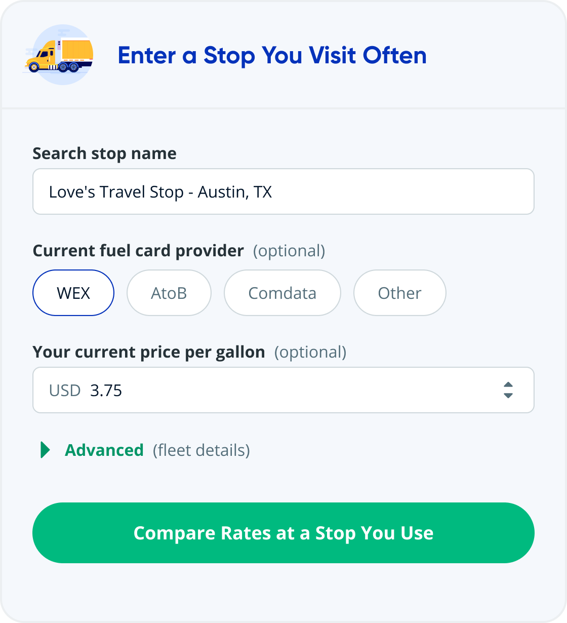 Puedes hacer tu primera compra en cuestión de minutos. Siempre que hayas agregado una tarjeta de débito o crédito para pagar, ¡estás listo para cargar combustible! Simplemente busca una parada de camiones en la que te gustaría repostar y obtén un código de combustible.